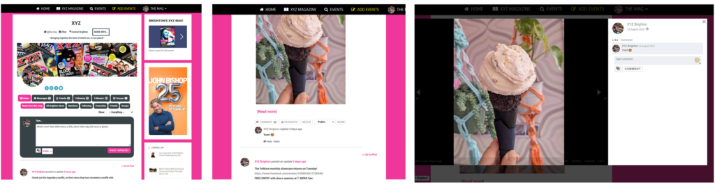 - Share your XYZ page at your socials – example post:”AMAZING NEWS! Brighton’s just got it’s own social network!! I’ve joined already, please connect with me there now at my page: xyzbrighton.com/your-page & let’s support this brilliant new FREE local tool to foster better local sharing online in the Brighton & Hove community, & kick it OFF! See you at XYZ Social!”