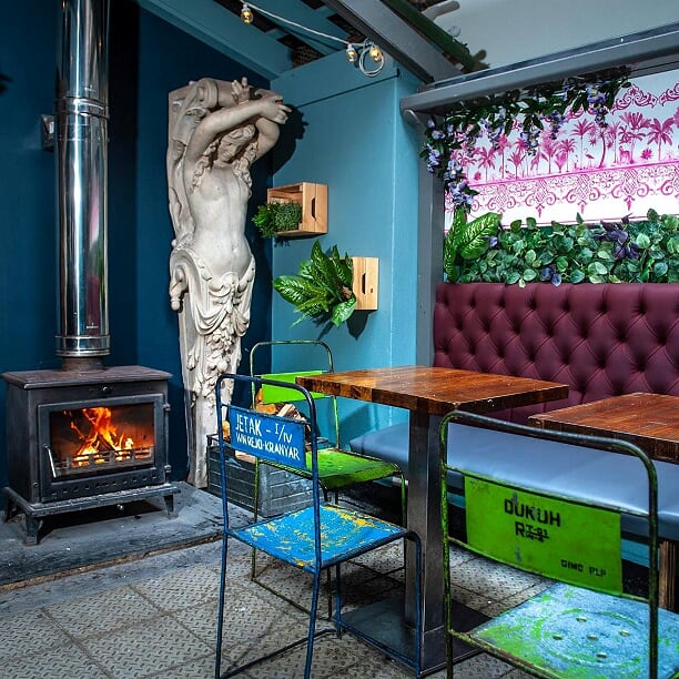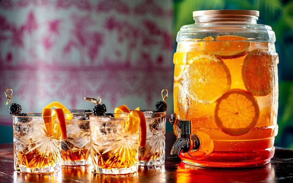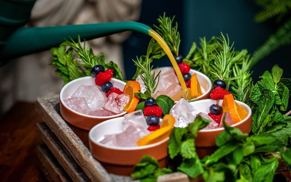 ‘Fitz for a King’, the Lost Garden’s cocktail bar! Heated outdoor terrace, retractable roof, outdoor fire- place, a cocktail menu that’s an horticultural delight, with sharing options served in wa- tering cans & plant pots, fresh flavours & home-grown herbs.